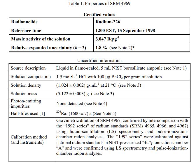 在 1998 年 9 月 15 日美國東部標(biāo)準(zhǔn)時(shí)間 1200 的參考時(shí)間,經(jīng)認(rèn)證的鐳 226 質(zhì)量活度值為:(3.047 ± 0.05) Bq?g-1