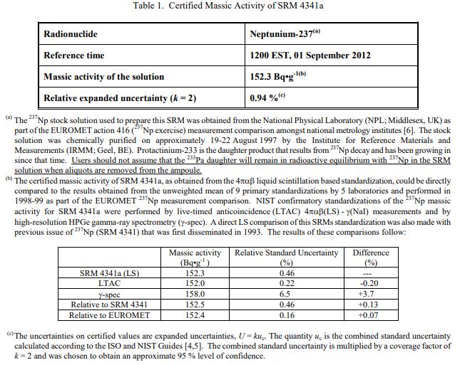 在 2012 年 9 月 1 日美國(guó)東部標(biāo)準(zhǔn)時(shí)間 1200 的參考時(shí)間,經(jīng)認(rèn)證的镎 237 質(zhì)量活度值為:(152.3 ± 1.4) Bq?g-1