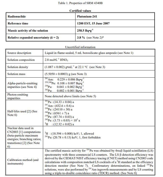 在 2007 年 6 月 15 日美國(guó)東部標(biāo)準(zhǔn)時(shí)間 1200 的參考時(shí)間,經(jīng)認(rèn)證的 Plutonium-241 質(zhì)量活度值為:(258.5 ± 9.8) Bq?g-1