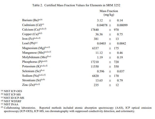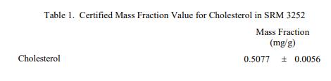 表 1 至表 3 中提供了 SRM 3252 中膽固醇、元素和維生素的認(rèn)證質(zhì)量分?jǐn)?shù)值,以干質(zhì)量為基礎(chǔ)報(bào)告。NIST 認(rèn)證值是 NIST 認(rèn)證的值對(duì)其準(zhǔn)確性的信心最高,因?yàn)樗幸阎蚩梢傻钠詈涂勺冃詠?lái)源都已考慮在內(nèi) [1]。價(jià)值分配分析由 NIST 和合作實(shí)驗(yàn)室進(jìn)行。認(rèn)證值計(jì)算為 NIST 方法的平均值和合作實(shí)驗(yàn)室提供的平均結(jié)果的中位數(shù)(在適當(dāng)?shù)那闆r下)。相關(guān)的不確定性以大約 95% 的置信水平表示 [2-4]。
