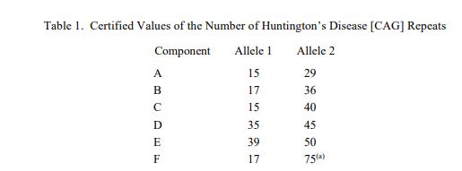 表 2 列出了 NIST SRM 2393亨廷頓病CAG重復(fù)長度突變(標(biāo)準(zhǔn)品) 組分的 DNA 質(zhì)量濃度的信息值。這些值是使用 SRM 2372 人類 DNA 定量標(biāo)準(zhǔn)品中的組分 A 校準(zhǔn)的五種定量聚合酶鏈?zhǔn)椒磻?yīng) (PCR) 方法的結(jié)果的平均值。在 hTERT 基因座處擴(kuò)增的商業(yè)定量 PCR 方法的相對(duì)較高結(jié)果被排除在平均值之外,因?yàn)樵摶蜃袝r(shí)在細(xì)胞系 DNA 中過度表達(dá) [4,5]。